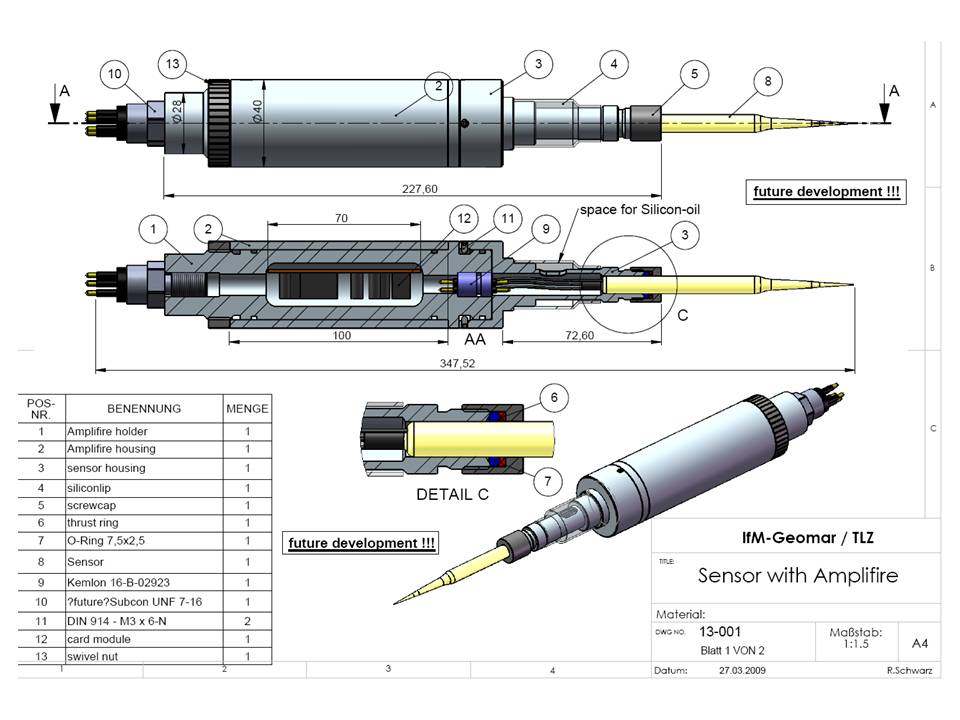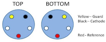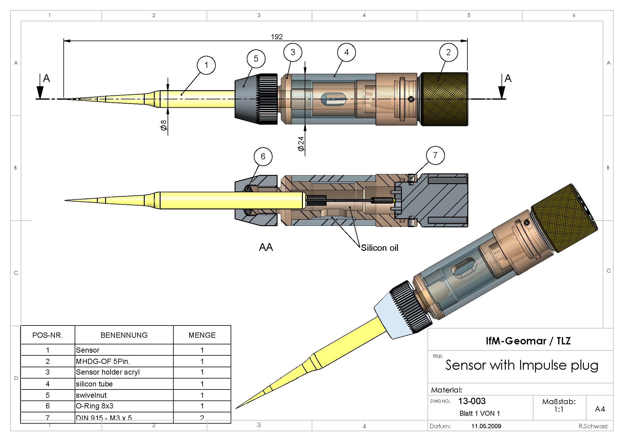 Pin specifications above are from Peter Berg, color labeling is same as for Anni Glud's sensors. Although a 3-pin connector could be used, we stay with 5-pin in the event another constituent would be measured (e.g. temperature) Sensor close-up with Impulse Plug |
