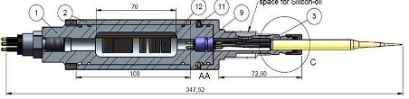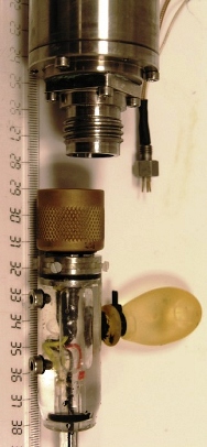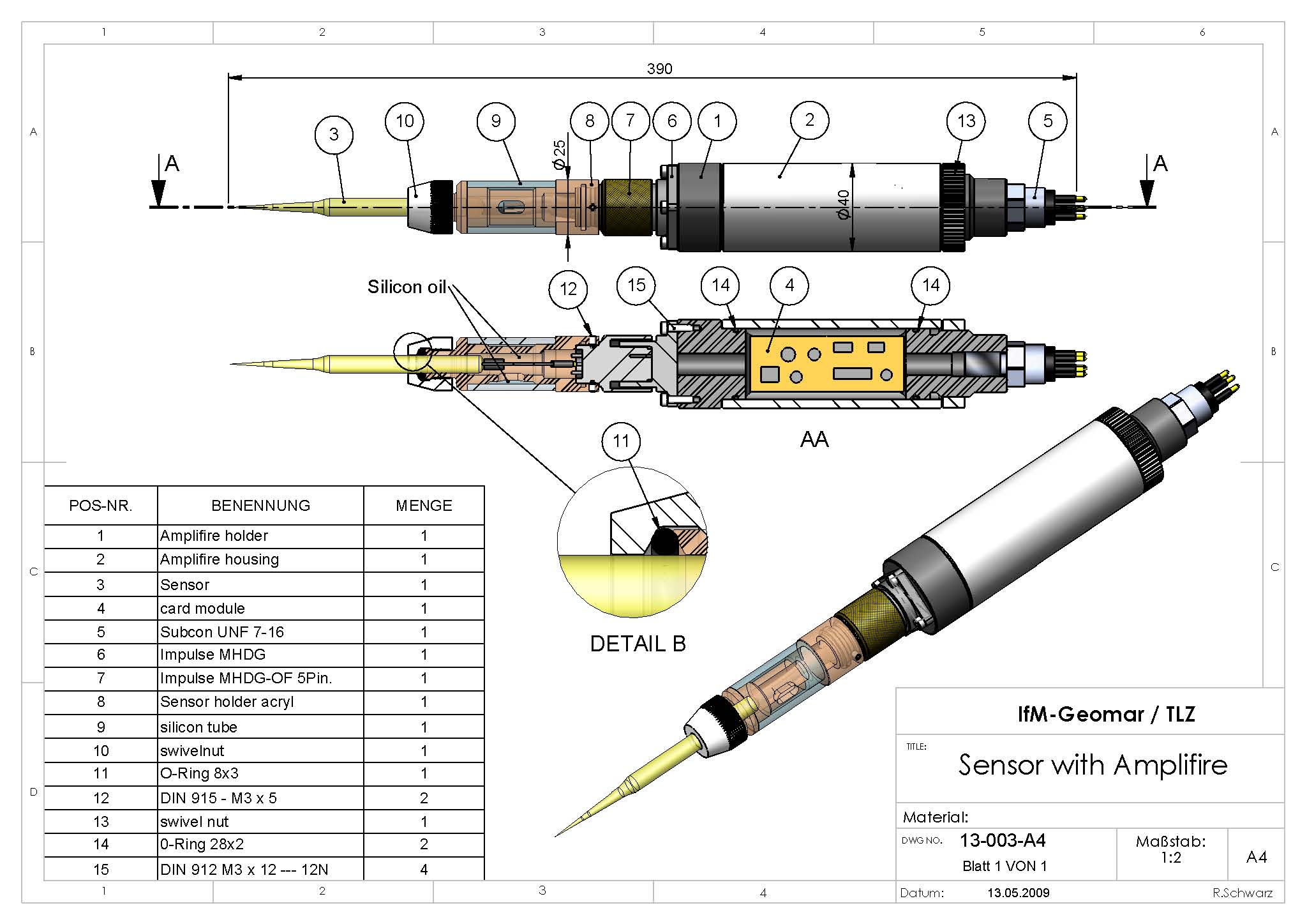 Amplifier Housing - Impulse Picture right is the amplifer housing and sensor holder. Amplifer uses Impulse 5-pin oil filled connectors. Connectors are pressure rated to ~340 atmosheres. Female (connects with electrode) minature high density 5-pin oil filled : MHDG-5-CCP-OF Male (connects with amplifier) minature high density 5-pin oil filled : MHDG-5-BCR-OF |
