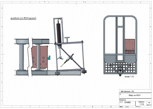 IFM - GEOMAR using ROV deployment The frame on the right is designed for deploying the EC by ROV in the extreme North Sea environment. Water body is tidally influenced, with currents ranging from 0 to 1 m/s. Concerns include vibration (either by frame, parts, or deployment ropes and buoys), as well as movement of the lander frame. Frame features include changeable feet... |