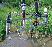 Standard Frame - Peter Berg’s design Peter Berg’s frame (shown top right) was used at Eawag (bottom right). Peter’s drawings were changed to SI and slightly modified by Lorenzo Rovelli (PhD Student). Frame is designed to be light, and easily deployed by hand in relatively slow current speeds. Allows resolution of fluxes from all directions, however flux artifacts caused by flow past legs is still unknown. Hand drawn plans |