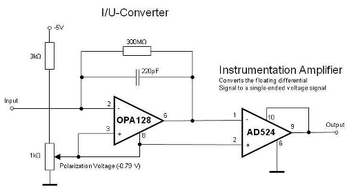 Amplifier from Eawag - same as from GRL paper (but here capacitor is much smaller). In principle, this amplifier works but has no galvanic isolation. With galvonic isolation, the OPA would need to be replaced. The amp design was simulated for signal loss by Peter Berg. |