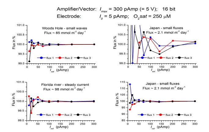 Quoting Peter Berg: "I have taken 3 data series measured with Volker's high-quality amplifier, each with 3 busts, and simulated the signal processing from: (electrode tip) to (amplifier) to (filter board) to (analog/digital converter) to (counts in Vector). The 16 bit analog/digital conversion in a standard Vector gives some loss of information. Then, I have recalculated the O2 concentration from the counts and finally recalculated the flux. The plots show the change in flux (100% = no change) as a function of "Isat" the saturation current of the micro electrode. High values of Isat gives good resolution on O2 concentration. The small fluxes from Japan (~ 2 mmol m-2 day-1) are most challenging as expected, but with a good electrode it should be possible to measure them - Good news, I think!" |